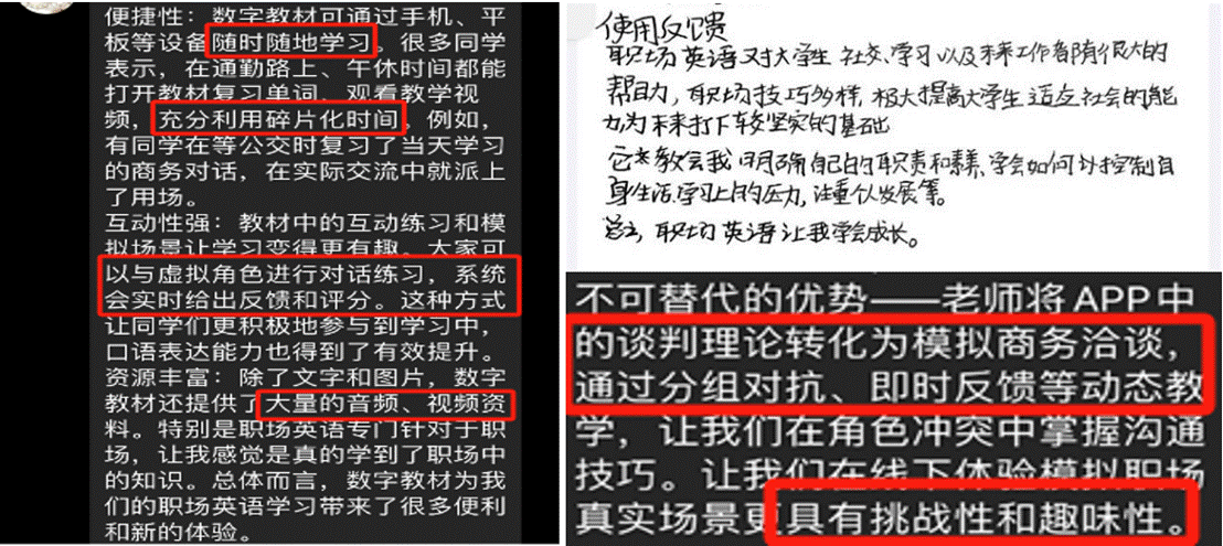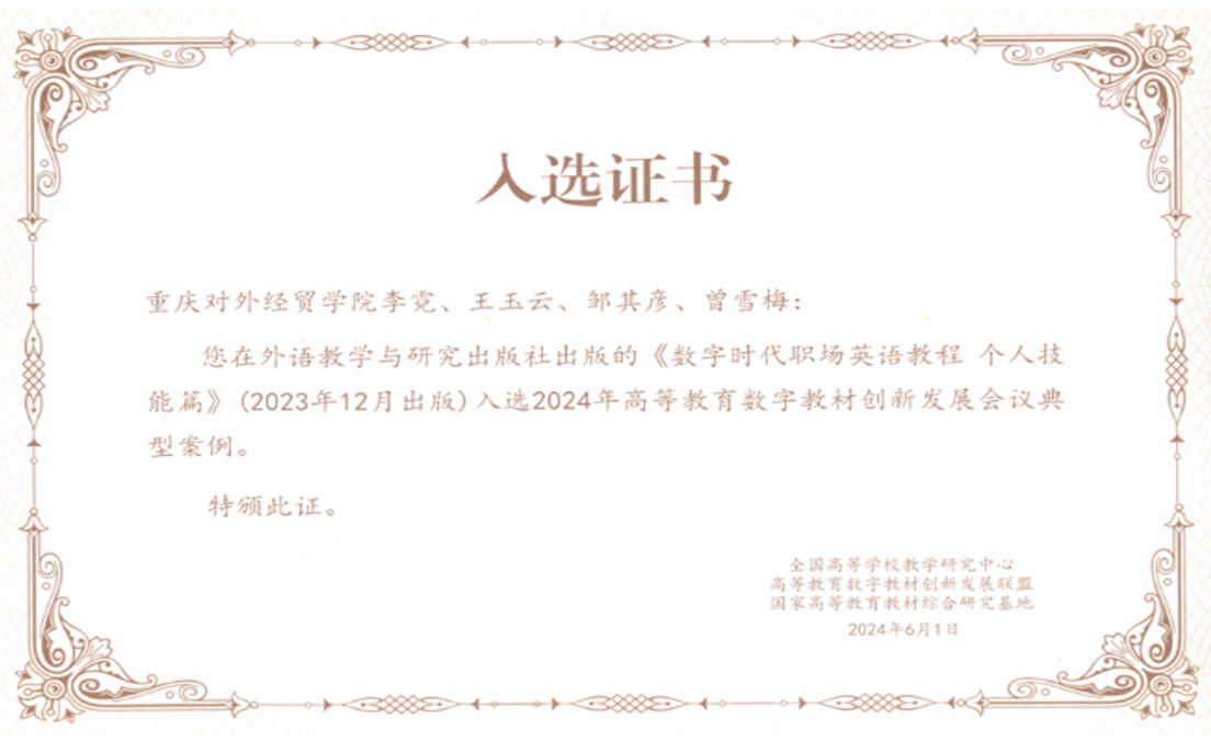 自2021年起,为主动应对中国式现代化对高素质复合型人才的迫切需求,以及新一轮科技革命对教育形态带来的深刻影响,课程团队在系统分析国内外知名智库报告、开展行业访谈与长期追踪调研的基础上,精准提炼出符合时代要求的职业核心能力集群,并以此为核心编写数字教材。该教材与国家一级出版社——外语教学与研究出版社达成合作,于2023年正式出版,并在“U校园”智慧教学云平台同步上线,同年被正式列为校本教材。至2024年,该教材获评“全国高等学校数字教材典型案例”,成为全国外语类教材及民办高校中唯一入选的成果,标志着其在内容建设与数字融合方面达到国内先进水平。