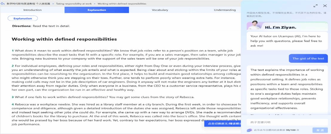 在功能实现层面,教材深度融合“U校园”智慧教学云平台,系统引入多样化数字教学工具,全面赋能教与学全过程。学生可借助课文点读、重难点解析、滑动式单词本、量表自动打分等功能开展自主学习,有效满足个性化学习需求;教师则依托学情分析报告、客观题自动评阅、语音测评等智能评价工具,实现对教学过程的精准把控与动态优化,显著提升教学效率与师生数字素养。