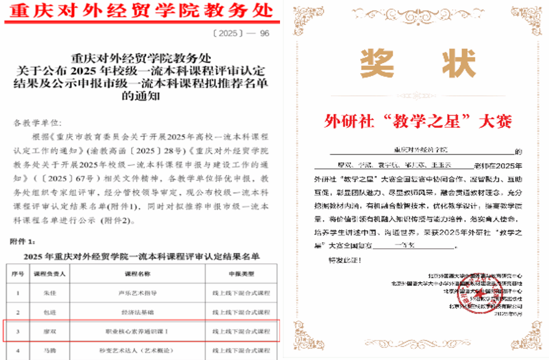 校级一流本科课程名单以及外研社“教学之星大赛奖状