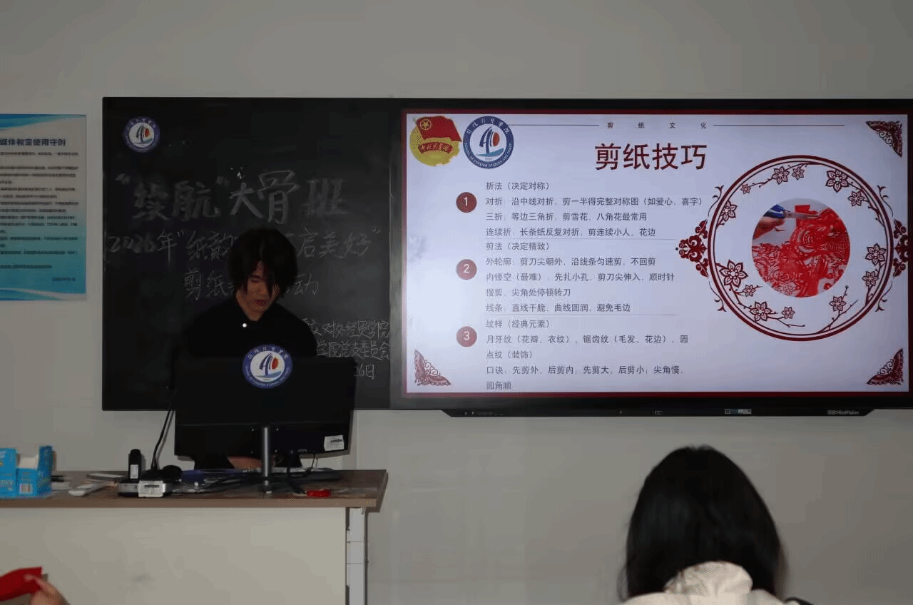 在剪纸文化与技艺分享环节,办公室工作人员贾鸿章同学从历史渊源、技法巧思、纹样寓意及文化内涵等方面入手,带领学员领略指尖上的东方美学。