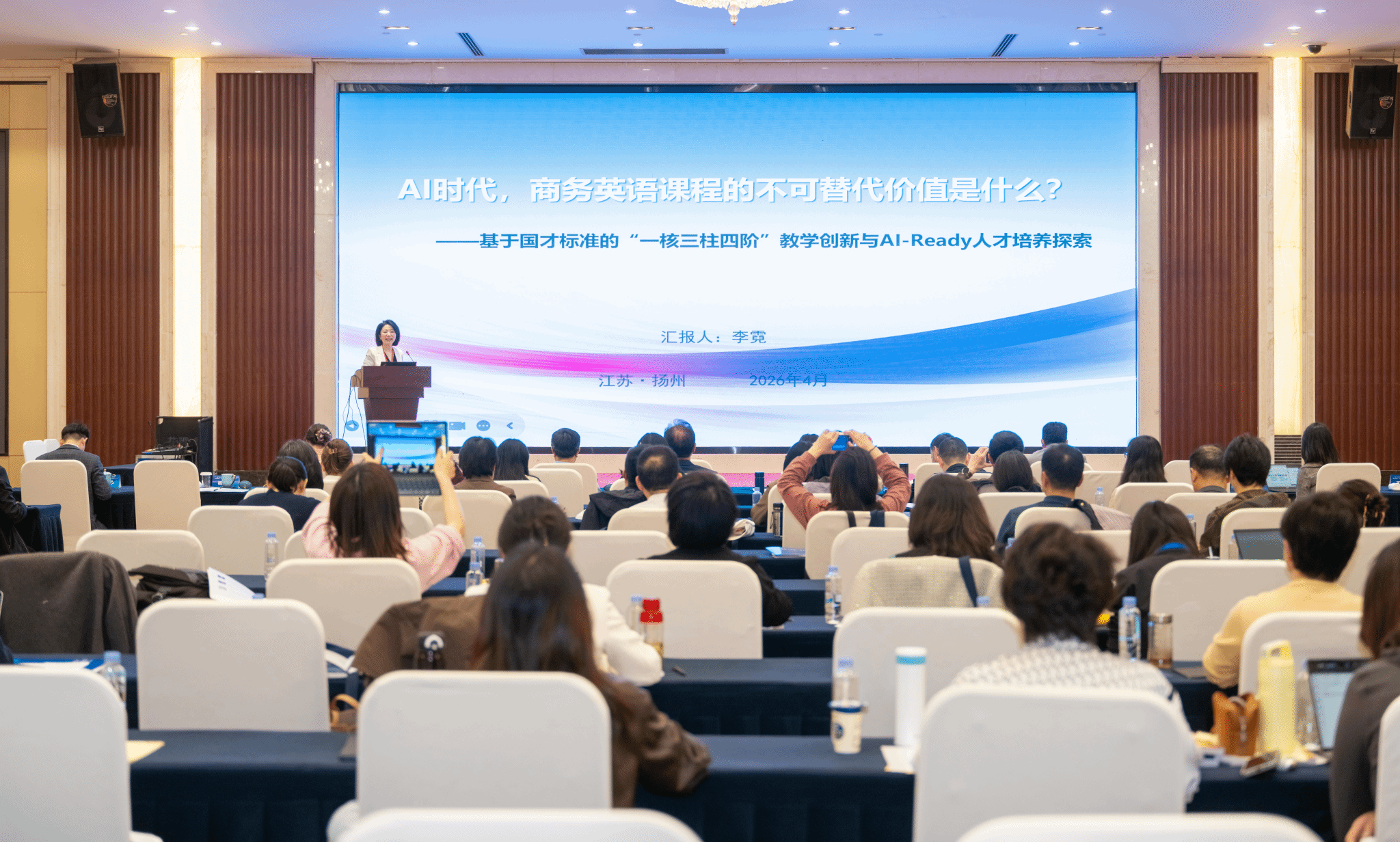 我院院长李霓教授应邀作主旨报告,题目为《AI时代,商务英语课程的不可替代价值是什么?——基于教材创新使用的“一核三柱四阶”教学实践与AI-Ready人才培养探索》。李院长从AI时代课程价值的重新追问切入,分析了当前教学面临的转化断层、认知脱节和AI冲击等现实挑战,提出商务英语课程的不可替代价值在于培养学生的内容判断力、受众适配力和跨文化重构力。她系统介绍了我院构建的“一核三柱四阶”教学体系及A-F-R教学模式,分享了教材创新使用与AI-Ready人才培养方面的探索实践。李院长强调,教育的根本使命是培养有判断力的人,这种面对真实情境作出独立判断和有效行动的能力无法由人工智能替代。
