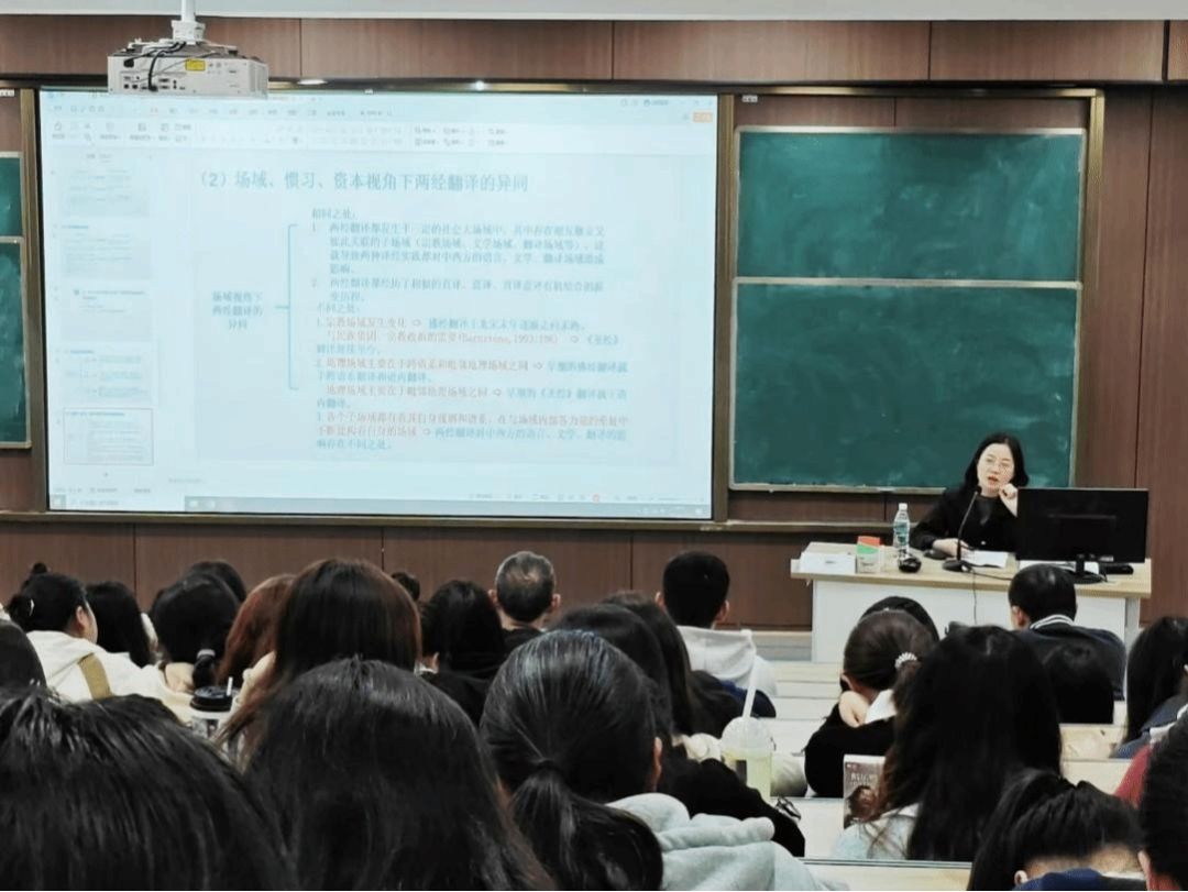 11月7日,重庆对外经贸学院外语外贸学院邀请到二级教授,博士生导师,中国英汉语比较研究会认知翻译学专业委员会常务理事、中国高等教育学会外语教学研究分会理事、国家社科基金通讯评审专家、四川省外国语言文学类专业教学指导委员会副主任委员、四川省学术和技术带头人、四川省认知语言学研究会副会长、四川省应用外语研究会副会长、四川省优秀教师、四川师范大学外国语学院院长曹曦颖教授为我校翻译专业的学生在合川B校区8307开展了“社会视域下的佛经翻译与《圣经》翻译比较研究”主题讲座。