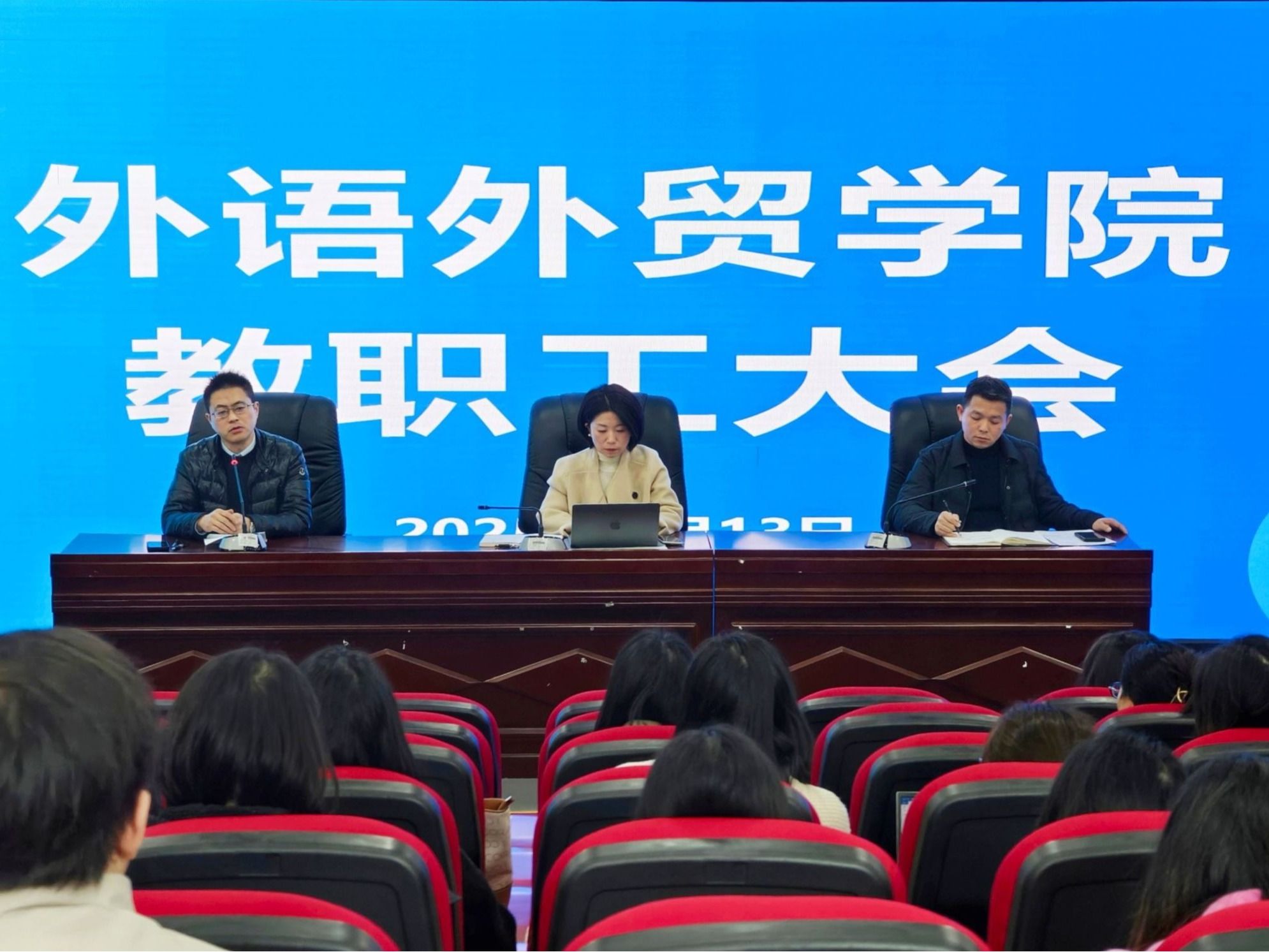 3月13日,外语外贸学院于B8105会议室召开教职工大会,围绕评估筹备、教学整改及安全建设等重点工作展开部署。会议由书记赵鹏主持,院长李霓、副院长吴耀熙分别就分管领域的工作作出了具体要求和安排。