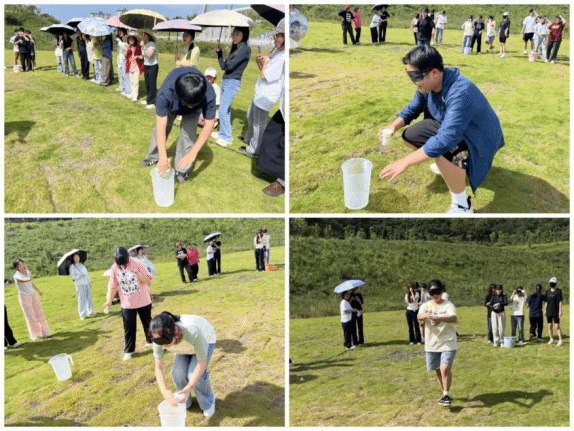 蒙眼运水项目中,每队派出5名蒙眼运水队员,在3分钟内将水运送至指定容器。场地上,指挥者的声音成为“导航仪”,蒙眼队员紧握水杯,仅凭同伴的指令调整方向,最终将水稳稳倒入容器中。