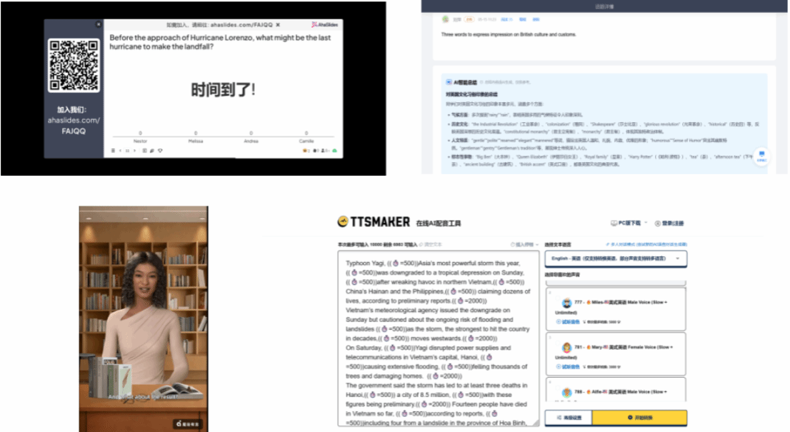 通过AI数字人“小i老师”,可承担如下任务:对长难句进行分步拆解讲解;以“角色模拟”的方式朗读或表演文本片段;在跨文化话题中充当“虚拟访谈对象”。有了数字人的加入,课堂从单一话语主体变为“教师+数字人+学生”的多主体互动,既减轻了教师的“独角戏”压力,也增强了学生的临场感与代入感