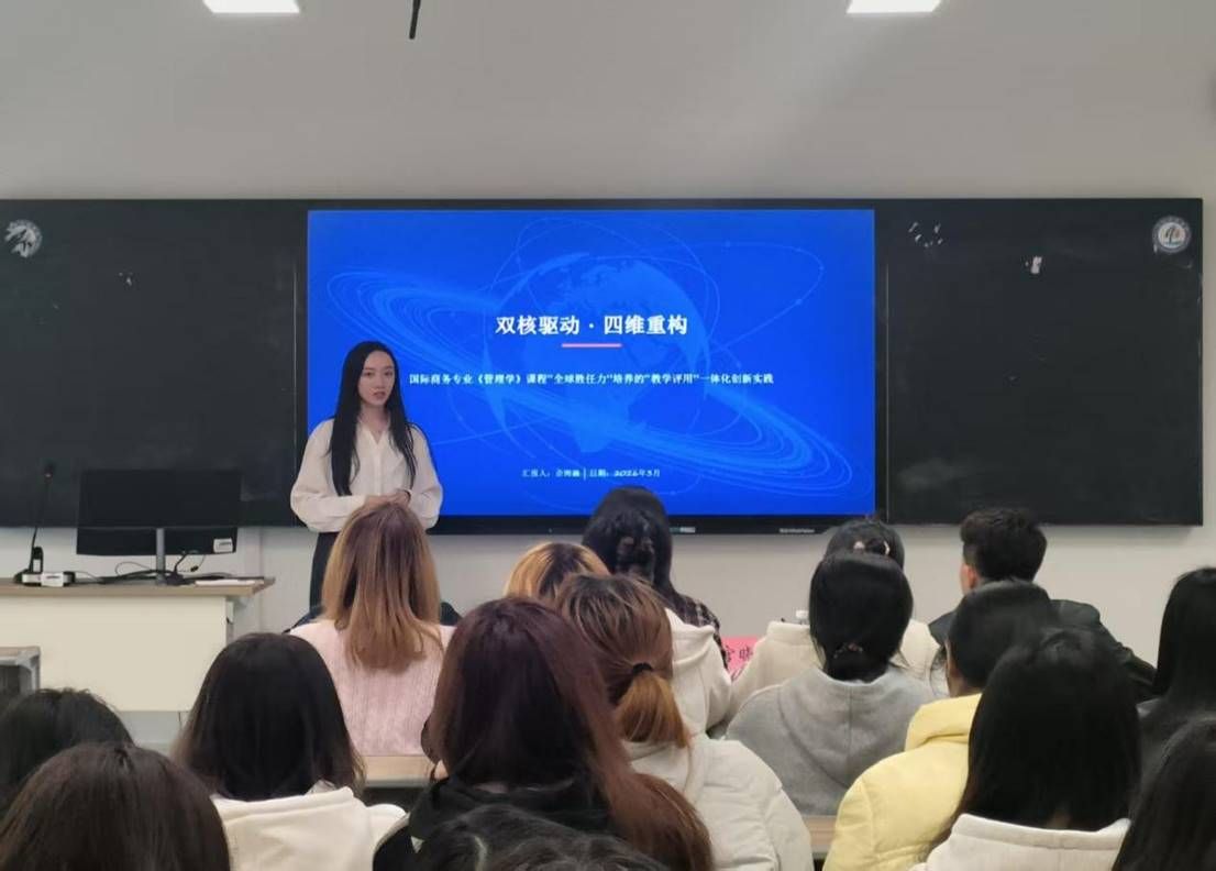 五位教师立足课程痛点,分别开展了教学创新:肖琴(大学英语)构建“四位一体”体系,贯穿课前课中课后;佘雨潞(管理学)采用“双核驱动+PBL”模式,解决知行脱节问题;刘思佳(大学英语)以浸润式教学丰富课堂场景;贺静(商务英语)设计“一核双线、四阶递进”方案;杨君(综合英语)系统优化教学目标与方法。改革均有效提升了学生学习效果。
