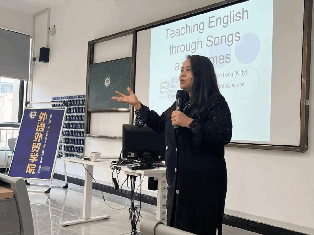 4月11日,为了激发同学们对英语学习的兴趣,鼓励同学们积极参与课堂活动,提高学生的学习积极性,重庆对外经贸学院外语外贸学院特邀泰籍外教Kitty老师于在B1309开展“用英语游戏化、歌曲开展英语教学”专题讲座。