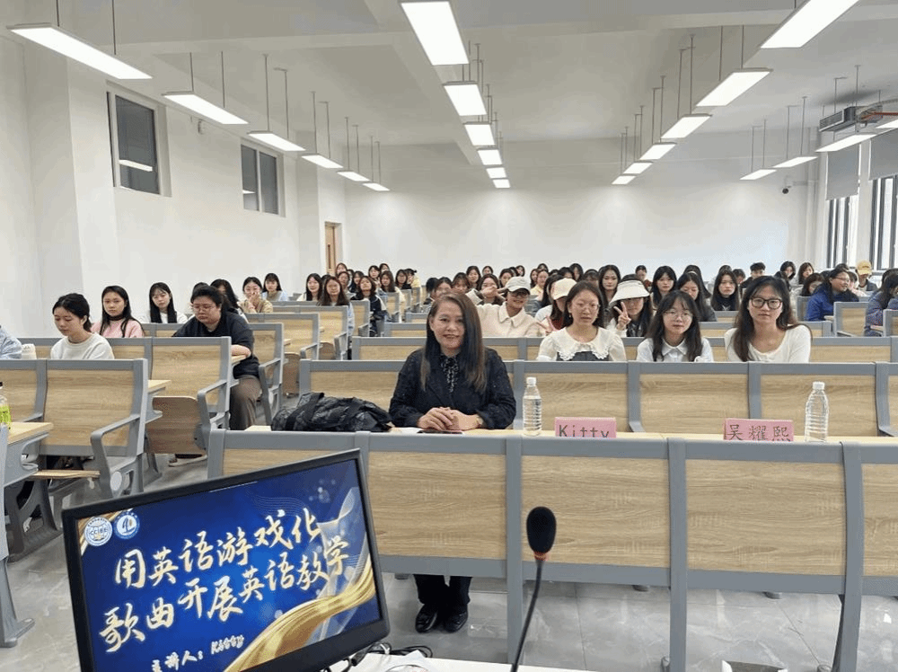 首先由主持人致词并介绍泰籍教师Kitty。紧接着,邀请Kitty老师上台为同学们进行“用英语游戏化、歌曲开展英语教学”专题演讲。Kitty老师围绕本次主题带领同学们一起学习多首英文歌曲并开展了几个小游戏。在Kitty老师的带领下,同学们积极参与课堂互动,相互交流想法并积极与外教老师交流分享心得体会。最后Kitty老师和同学们合影留念。此次专题讲座完美落下帷幕。