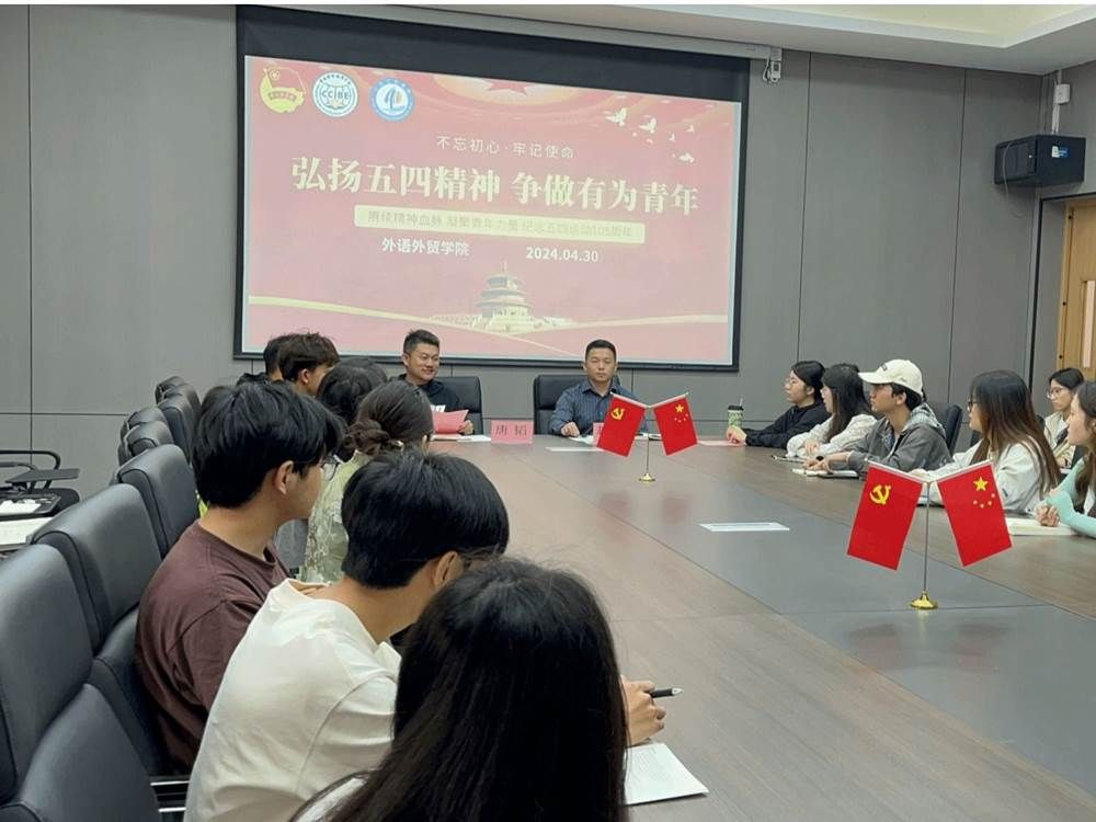 4月30日,青春跟党走,奋进新征程。为纪念五四运动爆发105周年,深入学习贯彻习近平总书记关于青年工作的重要思想,落实“四个善作善成”重要要求,动员全院青年学子生优秀为榜样,比学赶超,担当作为。外语外贸学院在B6103会议室召开“弘扬五四精神,争做有为青年”为主题的纪念“五四”运动105周年团员和青年代表座谈会。学院各班级团学干部、教师代表计50余人参加,党总支书记赵鹏出席并讲话,会议由辅导员唐韬老师主持。