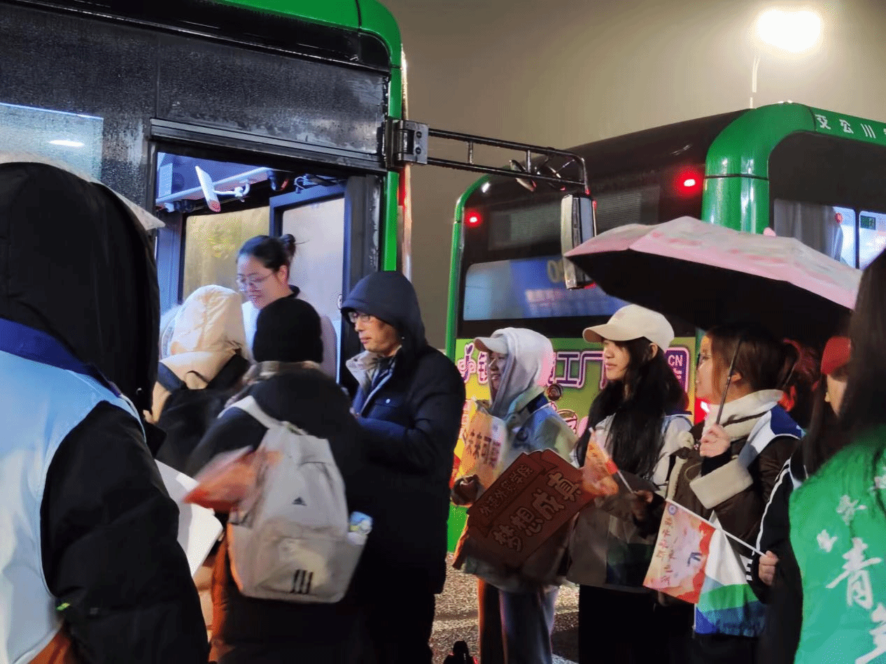 随后,在工作人员的引导下,考研学子有序登上送考大巴,师生们仍站在车旁挥手致意,直到大巴缓缓驶离。整个送考过程中,从列队迎接到乘车引导,每一个环节都井然有序,雨中的红色横幅与暖心的祝福,成为校园里一道动人的风景线。