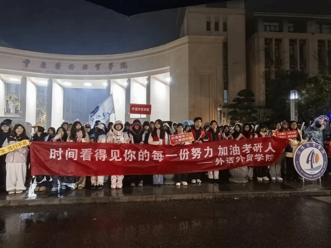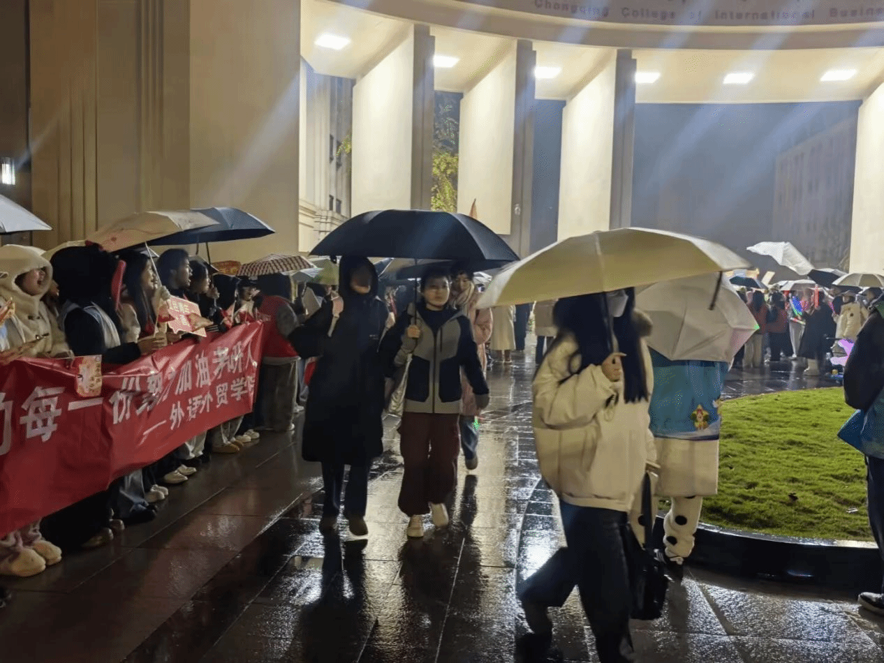 清晨,参与送考的师生准时集结在校园主干道与乘车点,大家手持横幅、举着标语牌,站成整齐的队列。首先,当考研学子撑着伞陆续走向乘车点时,同学们齐声喊出“研途落笔,一战上岸,外语外贸学子考研加油”的口号;接着,志愿者们轻声叮嘱他们“放平心态,正常发挥。”